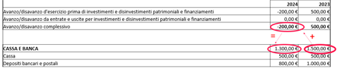 I modelli ministeriali, come è noto, si articolano su due colonne distinte, denominate “Es.t” e “Es.T-1” che stanno a indicare rispettivamente l’esercizio in corso e l’esercizio precedente, di modo da dare evidenza non solo della differenza di importi e dell’andamento amministrativo dell’associazione negli anni, ma anche dell’eventuale patrimonio residuo derivante da esercizi precedenti. Così in calce al modello di bilancio, le associazioni in “Cassa e banca” devono inserire da un lato il saldo totale alla chiusura dell’esercizio precedente, articolato in saldo presente in cassa e saldo bancario o postale, e dall’altro il saldo alla chiusura dell’esercizio appena conclusosi. Questi saldi coincidono evidentemente con i risultati oggettivi derivanti da estratti conto bancari sommati ad altri saldi amministrativi (saldo cassa, saldo libretto postale, etc.).